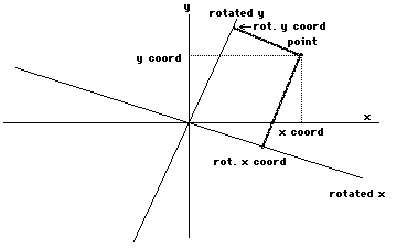 Now the x and y coordinates of a pointare going to depend on whether they are measured from theunrotated axes or from the rotated axes. To say it another way,the distance of the point from each axis depends on whether ornot the axis is tilted. The coordinates of the point are relativeto the orientation of the axes--it is as simple as that.